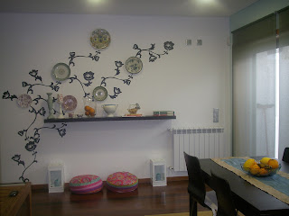 (Aqui fiz um arranjo na parede com stickers do Ikea e misturei pratos antigos que a minha mãe me deu com alguns pratos da Zara Home)